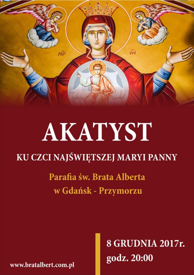 W Uroczystość Niepokalanego Poczęcia NMP, w piątek 8 grudnia 2017, połączone zespoły muzyczne wykonają w naszym kościele Akatyst ku czci Bogurodzicy. Jest on jedną z najpiękniejszych form kultu maryjnego w kościołach wschodnich. Początek o godz. 20.00.