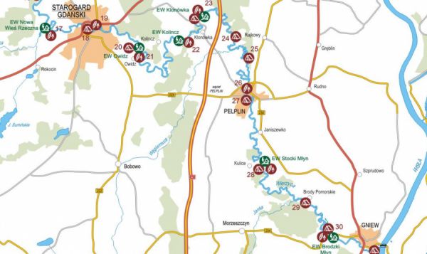 30,5 km rzeki – Pelplin Ślady osadnictwa pochodzą z młodszej epoki kamiennej, a pierwsza wzmianka z roku 1274 – właśnie wtedy Mściwoj II przekazał ziemie zakonowi cystersów. Klasztor przeżył burzliwe dzieje (najazd husytów, wojna trzynastoletnia, „potop szwedzki”), ale i wiele pozytywnych wydarzeń oraz wizyt (Kazimierza Jagiellończyka, Zygmunta III Wazy, Gustawa Adolfa, Władysława IV, Jana III Sobieskiego). Pelplin to przede wszystkim siedziba diecezji. Bezcennym zabytkiem architektury jest wspaniały przejaw gotyku – katedra i zespół pocysterski, swego czasu druga co do wielkości (po Kościele Mariackim w Gdańsku) świątynia w Polsce. To budowana na przełomie XIII i XIV wieku bazylika na planie krzyża łacińskiego, której wyposażenie datuje się od XV wieku. Są to: 22 ołtarze, ogromnej wysokości późnorenesansowy, drewniany ołtarz główny o wysokości 25 m (dla porównania dzieło Wita Stwosza to 13 m), obraz z 1623 roku Koronacja NMP pędzla Hermana Hahna o wielkiej wartości historycznej oraz barokowe organy. Tuż obok atrakcją jest wirydarz (ogród klasztorny). Konieczne odwiedzenia jest Muzeum Diecezjalne (skarbnica architektury i sztuki sakralnej). Perły w zbiorach to Biblia Gutenberga (jedyny egzemplarz w Polsce i jeden z kilkunastu rozsianych po świecie) oraz Madonna szafkowa z Klonówki. Ponadto biblioteka diecezjalna zawiera setki cennych inkunabułów.